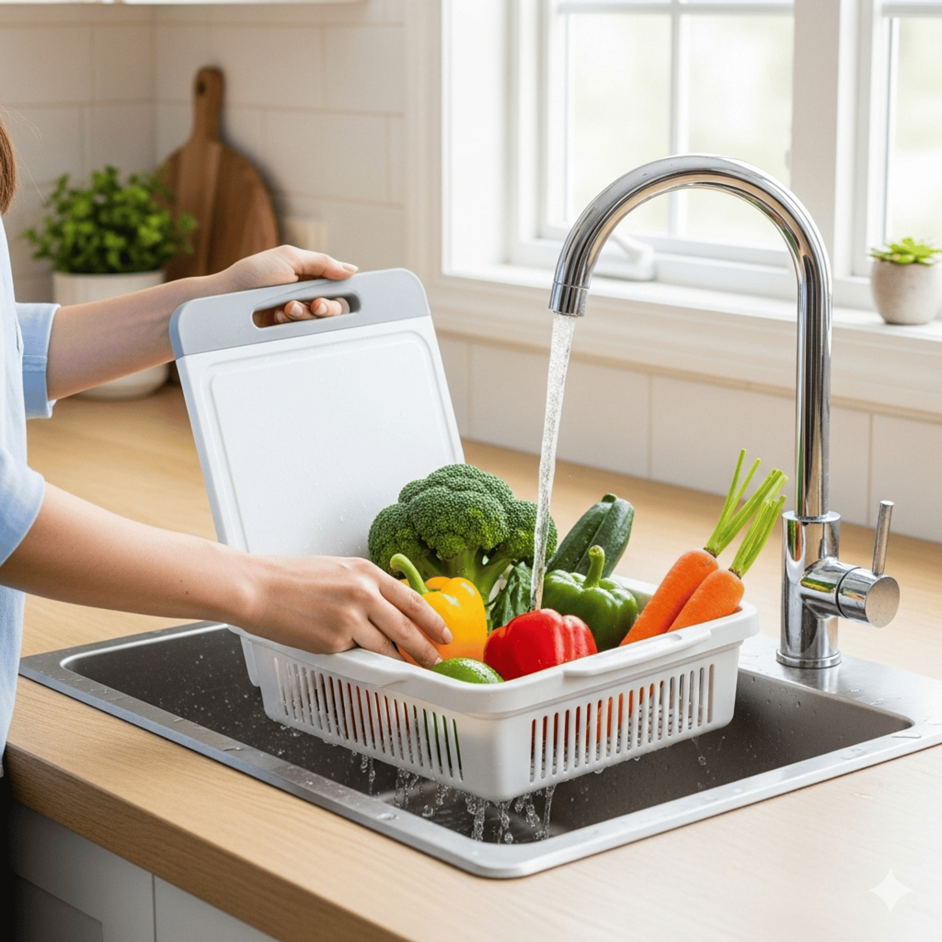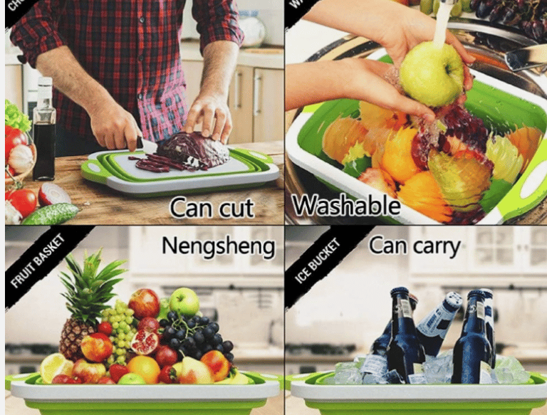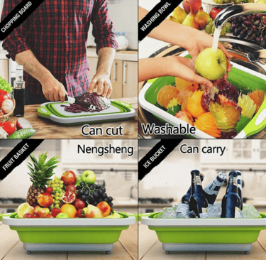 The multifunctional foldable water filter basket can save your storage space and can be folded to form a cutting board.